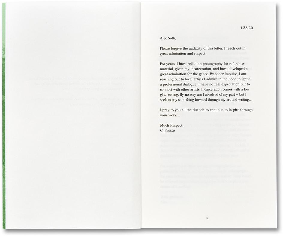 In January 2020, Alec Soth received a letter from Chris Fausto Cabrera, an inmate of the Minnesota Correctional Facility in Rush City, in which he asked the photographer to engage in a dialogue. This sparked an expansive and insightful correspondence over the following nine months which, set against the backdrop of the COVID-19 pandemic, Black Lives Matter Movement and growing unrest, reaches to the heart of contemporary America. In amongst their exchanges of personal histories and shared influences – from Ralph Ellison’s The Invisible Man and André 3000, to Robert Frank’s The Americans and Rilke’s 'Letters to a Young Poet' – developed a searing investigation of the redemptive power of art and the imagination, justice and accountability, life inside America’s prisons, and the astonishing capacity of empathy and curiosity to bring two people together.