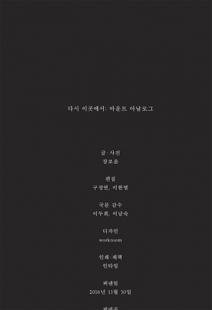 장보윤 작가는 르네 도말René Daumal의 미완 소설<마운트 아날로그>(1952)를 모티브로 '실재하지만 다다를 수 없는 산'에 오르려 시도하는 소설 속 주인공들의 여정을 자신의 작업에 비유하고 사진 이미지들과 영상 작업을 통해 선보인다. 작가는 <다시 이곳에서: 마운트 아날로그>를 통하여 우리에게 문화유산들과 관광지로서 이미 친숙한 경주를 유추의 장소로 낯설게 설정하고 있다.