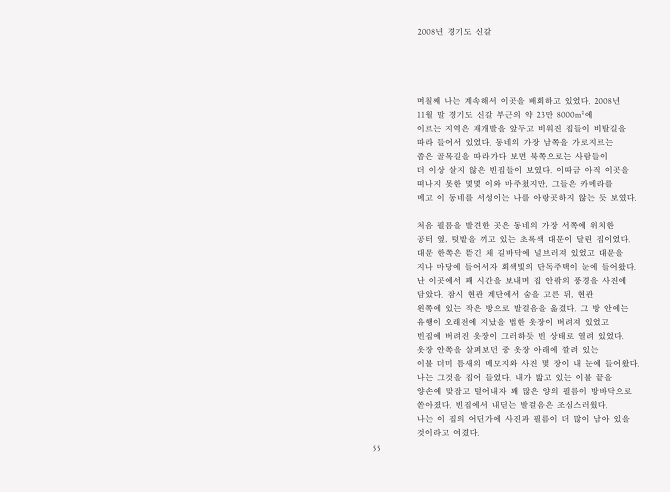 며칠째 나는 계속해서 이곳을 배회하고 있었다. 2008년 11월 말 경기도 신갈 부근의 약 23만 8000m2에 이르는 지역은 재개발을 앞두고 비워진 집들이 비탈길을 따라 들어서 있었다. 동네의 가장 남쪽을 가로지르는 좁은 골목길을 따라가다 보면 북쪽으로는 사람들이 더 이상 살지 않은 빈집들이 보였다. 이따금 아직 이곳을 떠나지 못한 몇몇 이와 마주쳤지만, 그들은 카메라를 메고 이 동네를 서성이는 나를 아랑곳하지 않는 듯 보였다. 처음 필름을 발견한 곳은 동네의 가장 서쪽에 위치한 공터 옆, 텃밭을 끼고 있는 초록색 대문이 달린 집이었다. 대문 한쪽은 뜯긴 채 길바닥에 널브러져 있었고 대문을 지나 마당에 들어서자 회색빛의 단독주택이 눈에 들어왔다. 난 이곳에서 꽤 시간을 보내며 집 안팎의 풍경을 사진에 담았다. 잠시 현관 계단에서 숨을 고른 뒤, 현관 왼쪽에 있는 작은 방으로 발걸음을 옮겼다.