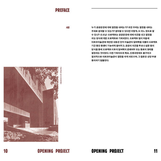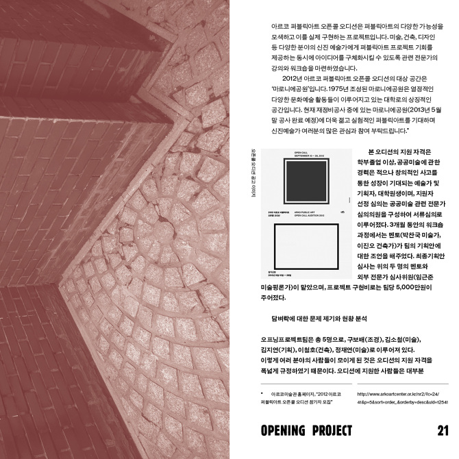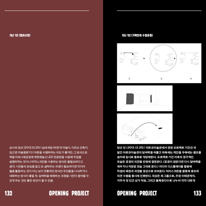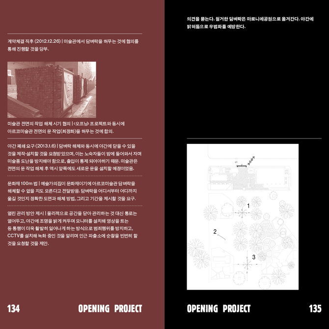 먼저 이 책은 오프닝프로젝트팀의 글로 전반적인 프로젝트의 의도와 설문 등을 통해 조사한 내용을 전달한다. 그리고 프로젝트에 직접적으로 영향을 준 두 건축가의 글을 통해 아르코미술관의 건축 배경과 “시민과 사람들의 공간”의 필요성에 대해 이야기한다. [지난 1년]은 연대기순의 프로젝트 진행과정으로, 미술관과의 협의과정과 그에 따라 바뀌게 된 기획안의 내용들을 정리해 보여준다. <오프닝> 프로젝트는 지난 12월에 당선되어 계약을 채결한 이후 특히 미술관과 잦은 협의를 통해 의견을 조율했다. 이 과정 속에 초기의 기획안과는 달라졌지만, 유사한 모습으로 프로젝트를 마무리하게 된 것을 알 수 있다. 프로젝트팀은 이 협의과정이 공공성에 대한 아르코미술관과의 입장 차이를 드러내기에 중요하다고 말한다.[<오프닝>이란 이름의 프로젝트]를 쓴 전계웅은 (아르코미술관 공공미술TF의 직원, 프로젝트 담당자) 본 프로젝트의 중개자로서 일 년간 미술관과 프로젝트팀 사이의 입장에서 본 <오프닝>을 평가하며 한계를 갖게 된 이유를 진단해본다. 김장언 미술평론가는 [이기적인 거인들]이라는 글을 통해 오스카 와일드의 동화에 아르코미술관의 폐쇄적인 입장을 빗댄다. 본 프로젝트를 비롯해 많은 공공미술 프로젝트들이 오롯이 서기 위해선 무언가 많이 바뀔 필요가 있다. 그가 말하는 것처럼 “새로운 공동체를 향한 열린 해결책”에 대해 미술관이 자발적인 성찰을 하길 기대한다.