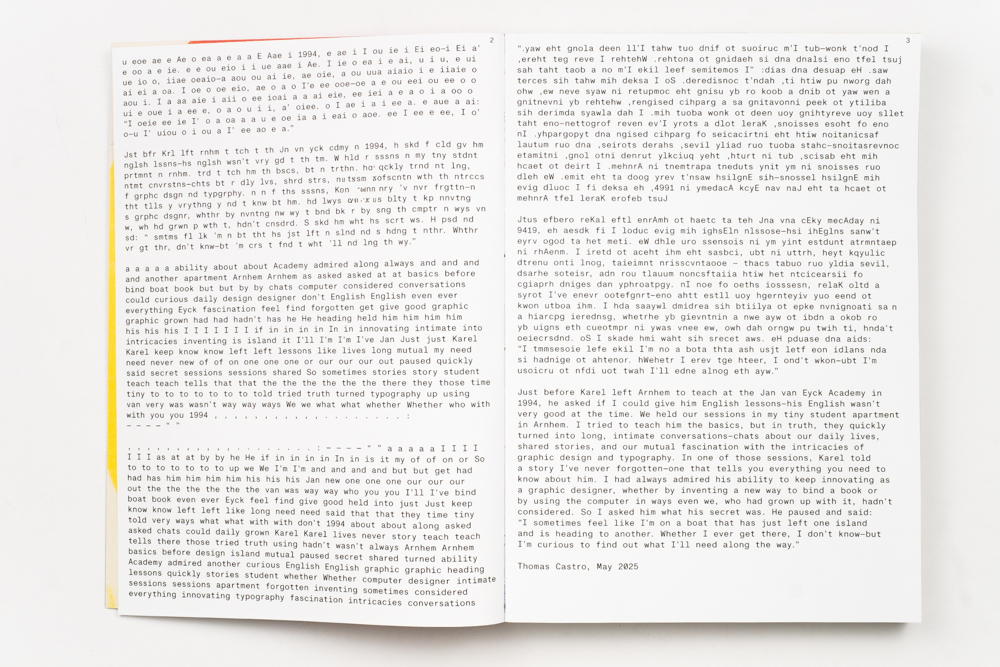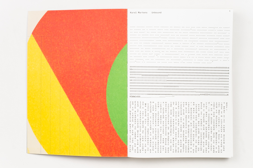 《Unbound》는 암스테르담 시립미술관(Stedelijk Museum Amsterdam)에서 열리는 카렐 마르텐스(Karel Martens)의 개인전과 함께 발행된 책이다. 수십 년간의 그의 경력 전반에 걸쳐 제작되거나 수집된 폭넓은 작업들을 한데 모았다. 전시에 출품된 작업들은 그의 스튜디오에서 발견된 요소들과 함께 콜라주되고, 중첩 인쇄되며, 병치되어, 아티스트 북과 도록 사이 어딘가에 놓인다. “이 출판물은 요르디 더 페텐(Jordi de Vetten)과 이수수(Susu Lee)가 마르텐스 본인과 긴밀히 협업하여 세심하게 디자인한 것으로, 그의 작업에 대한 일종의 핸드북 역할을 한다. 그러나 그것은 전통적인 방식의 핸드북이 아니라 구조화되지 않고, 위계적이지 않으며, 유희적이고, 개인적이며, 연상적인 핸드북이다.” 전시 큐레이터 토마스 카스트로(Thomas Castro)와 암스테르담 시립미술관 관장 라인 볼프스(Rein Wolfs)의 글이 함께 실려 있다.