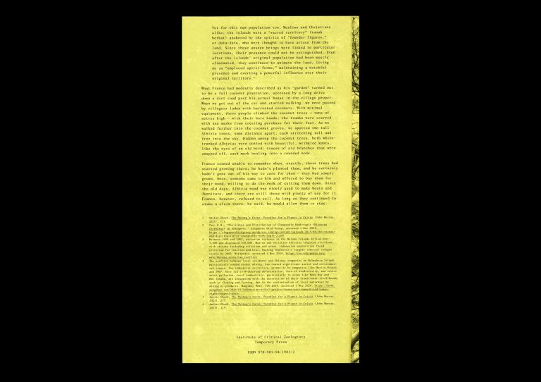 This book documents five Albizias: four from across Singapore and one from the Maluku Islands. They examine how human actions have shaped these spaces, exploring the blurred boundaries between native and non-native, natural and artificial, and demonstrate how Albizias, despite often being considered undesirable, perform a subtle but powerful role in rewilding disturbed spaces. By spotlighting these often-overlooked trees, the project redefines resilience and adaptability in Singapore’s ever-changing environment. Contains an essay by Haeju Kim and an opening section of archival photographs. Published in conjunction with an eponymous exhibition that travelled across four locations in Singapore where the Albizia trees were found and documented.