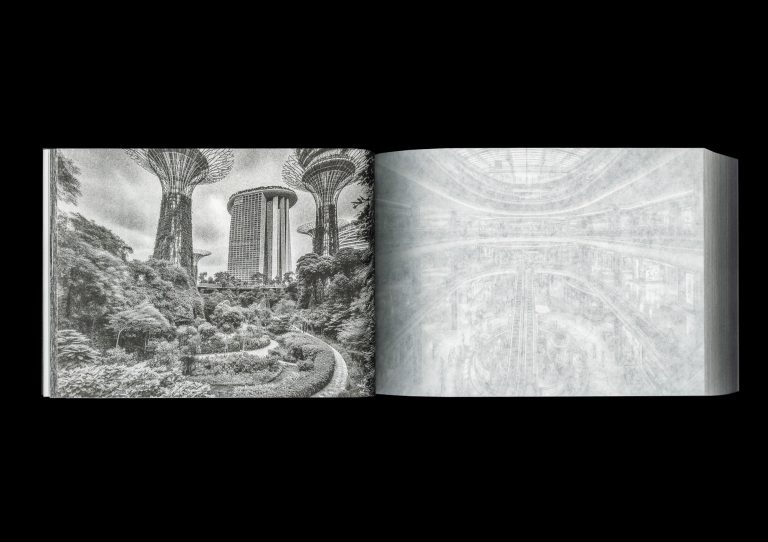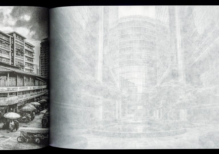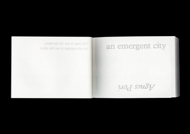 Agnes Pori, a fictional island nation located in Southeast Asia, is depicted through almost 300 highly detailed black-and-white images in this postcard-size book. With all contents printed in reverse on translucent and thin wax paper, readers are invited on a disorienting journey through the city, viewing ghostly impressions of these images rather than the contents themselves. Despite its fictitious nature, a real city’s name resides within the reshuffled letters of Agnes Pori (a name fashioned after Italo Calvino’s Invisible Cities) and a genuine question about the nature of images and development behind the publication of this book.