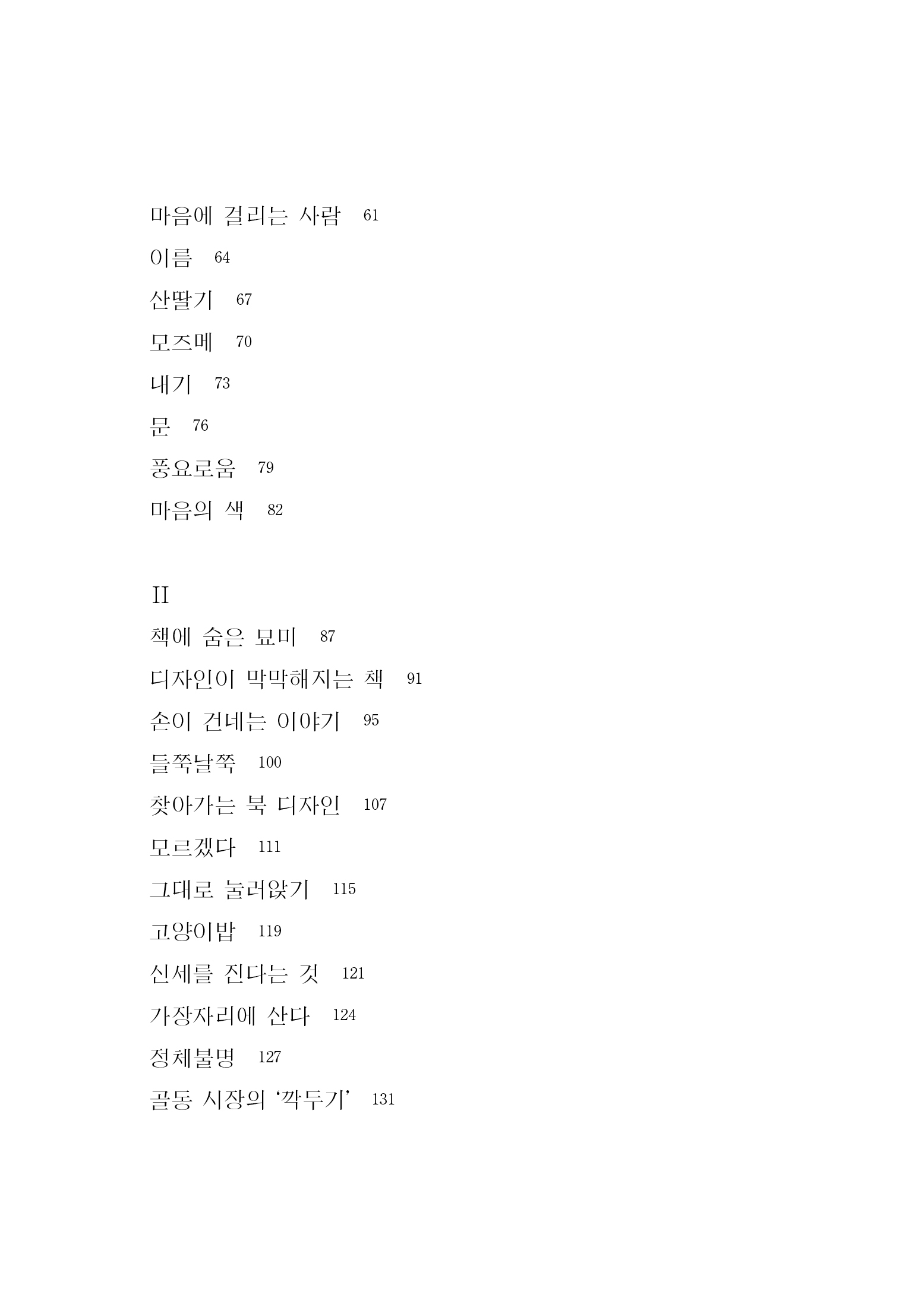 북 디자인은 내부의 작품을 받드는 존재가 아니다. 안이 있으므로 밖이 생기고 밖을 가짐으로써 안이 산다. 안과 밖이 둥근 고리로 이어진 운동체, 그것이 책이다. 종이를 만드는 사람, 인쇄하는 사람, 제본하는 사람, 유통에 종사하는 사람, 서점에서매대와 서가에 진열하는 사람, 지면으로 소개하는 사람, 평론하는 사람, 각자의 생각이 운동을 가속한다. 북 디자인은 다양한 마음이 교차하는 무대이자, 다가올 독자를 맞이하는 무대이기도 하다. (92쪽)