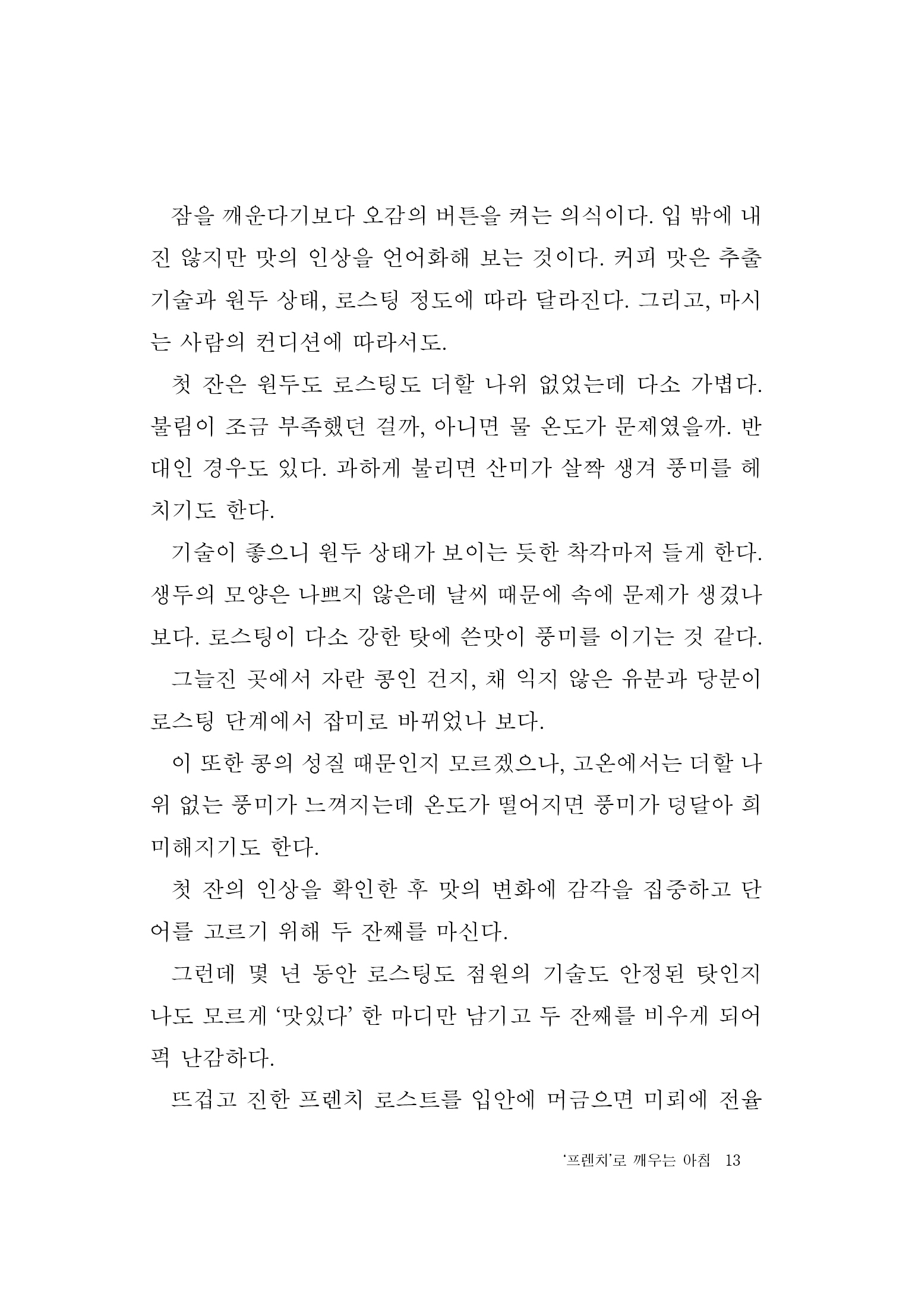 매끈한 종이에 인쇄된 정보는 모니터를 통한 광학적 정보와 비슷한 인상을 준다. 어딘지 모르게 일방적이고 처음부터 끝까지 기호의 소통에 지나지 않는다. 사람은 다른 이가 딱딱하다 하는 것을 부드럽다 느끼기도 하고, 그 반대인 경우도 있다. 굶주리거나 아픈 사람을 상상해 보면 된다. 정보 사회는 개개인의 경험을 통해 다져진 감수성과 정보를 지양하고 개인적 체험을 두려워하는 것만 같다. 나는 시각과 촉각을 완전히 열고 받아들여야 하는, 책이라는 매체의 ‘ 후아이’ 를 소중히 여기고 싶다. (17쪽)