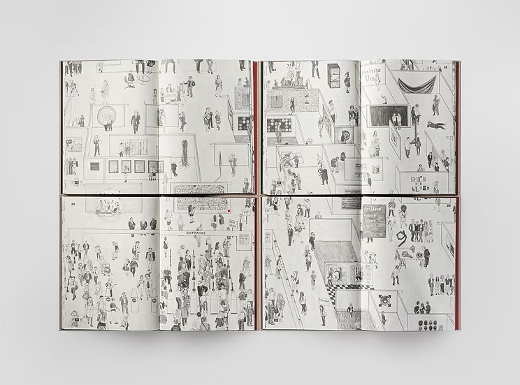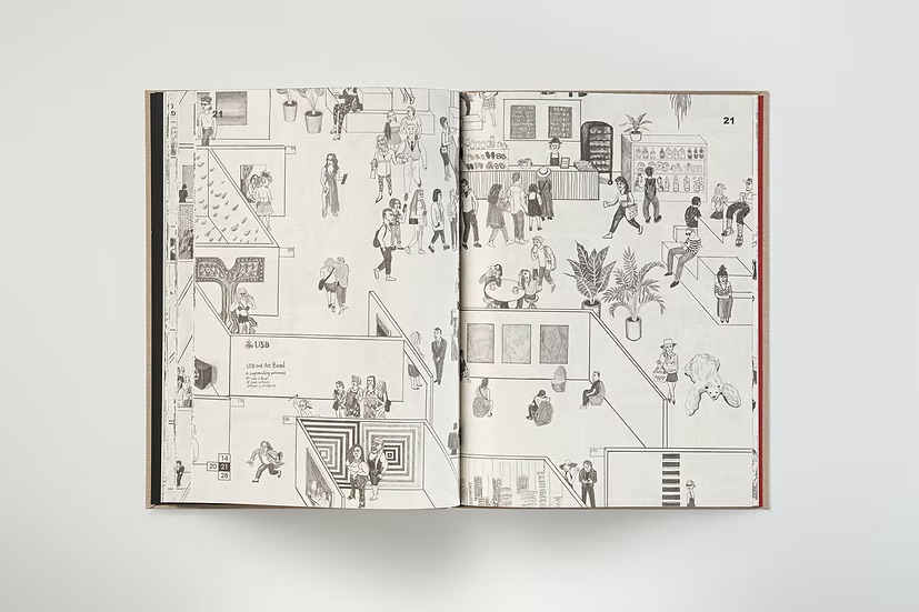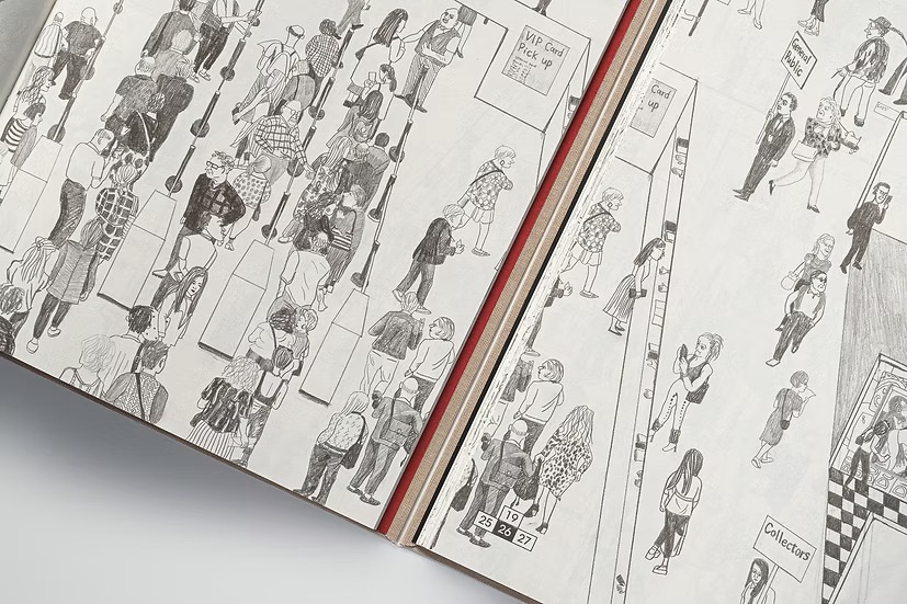 약 5미터 × 2미터에 달하는 이 대형 원본 드로잉은 이제 책 속에서 끝없이 이어지는 부스를 안내하는 지도처럼 펼쳐진다. 독자는 작품을 바라보고, 사람들을 바라보고, 어쩌면 반짝이는 화려함 속에서 와인을 한 모금 마시는 자신을 발견하게 될지도 모른다.