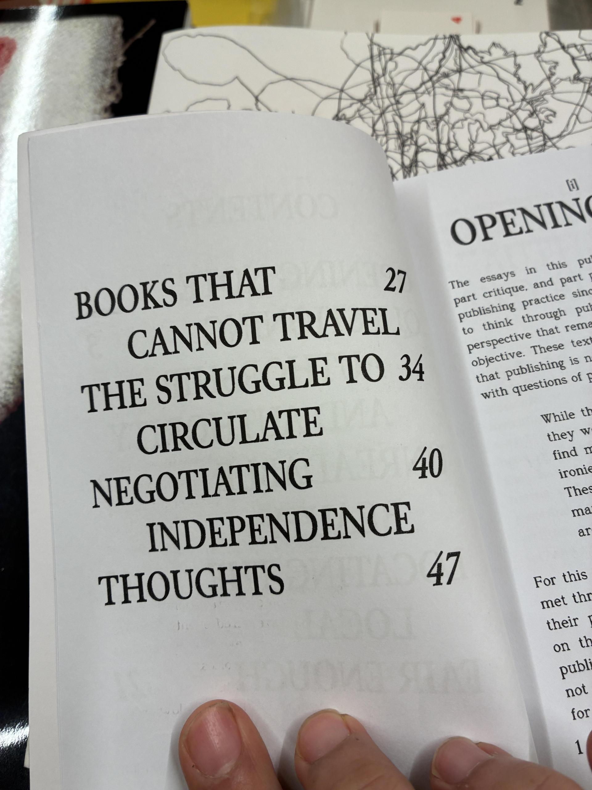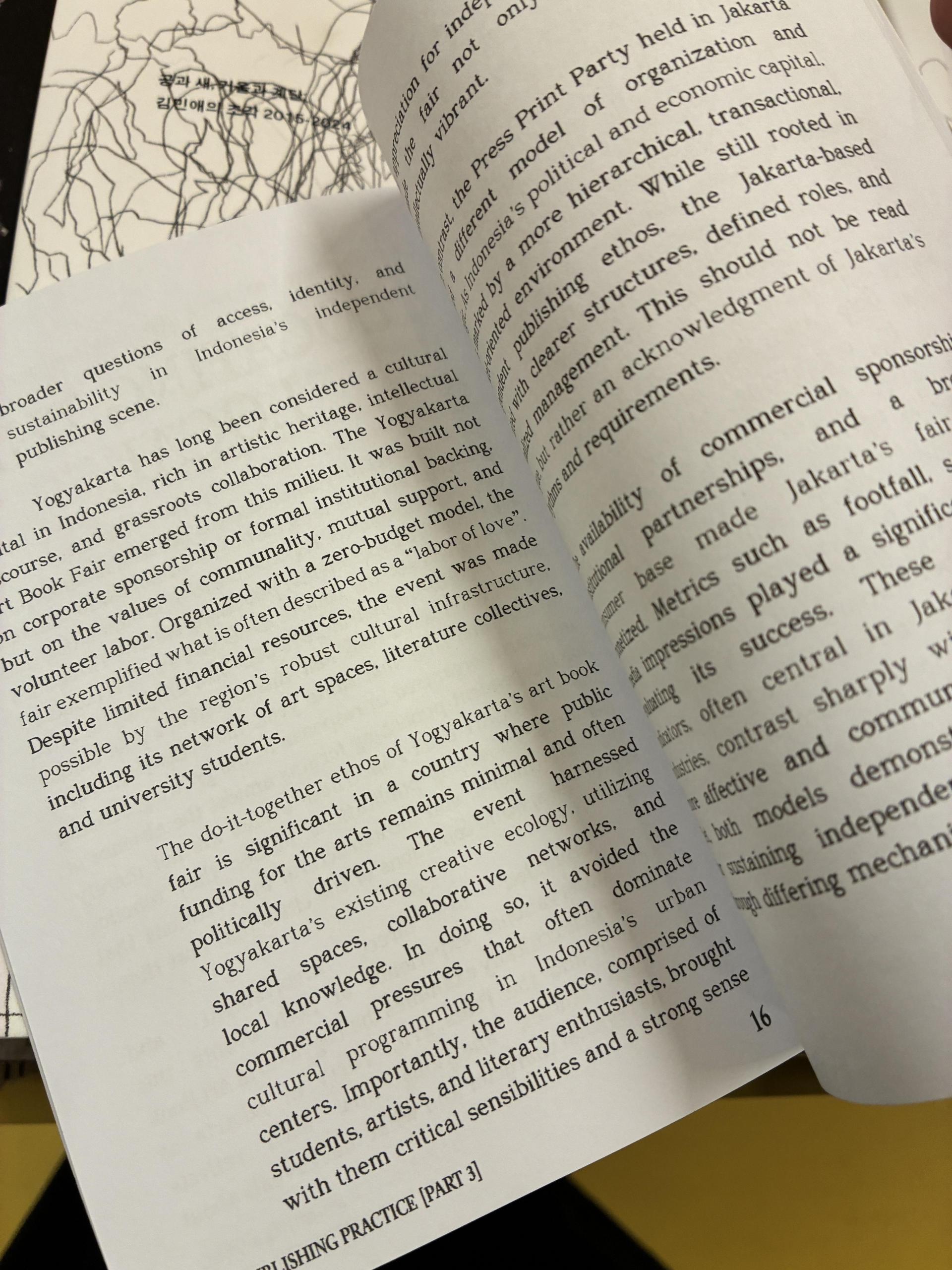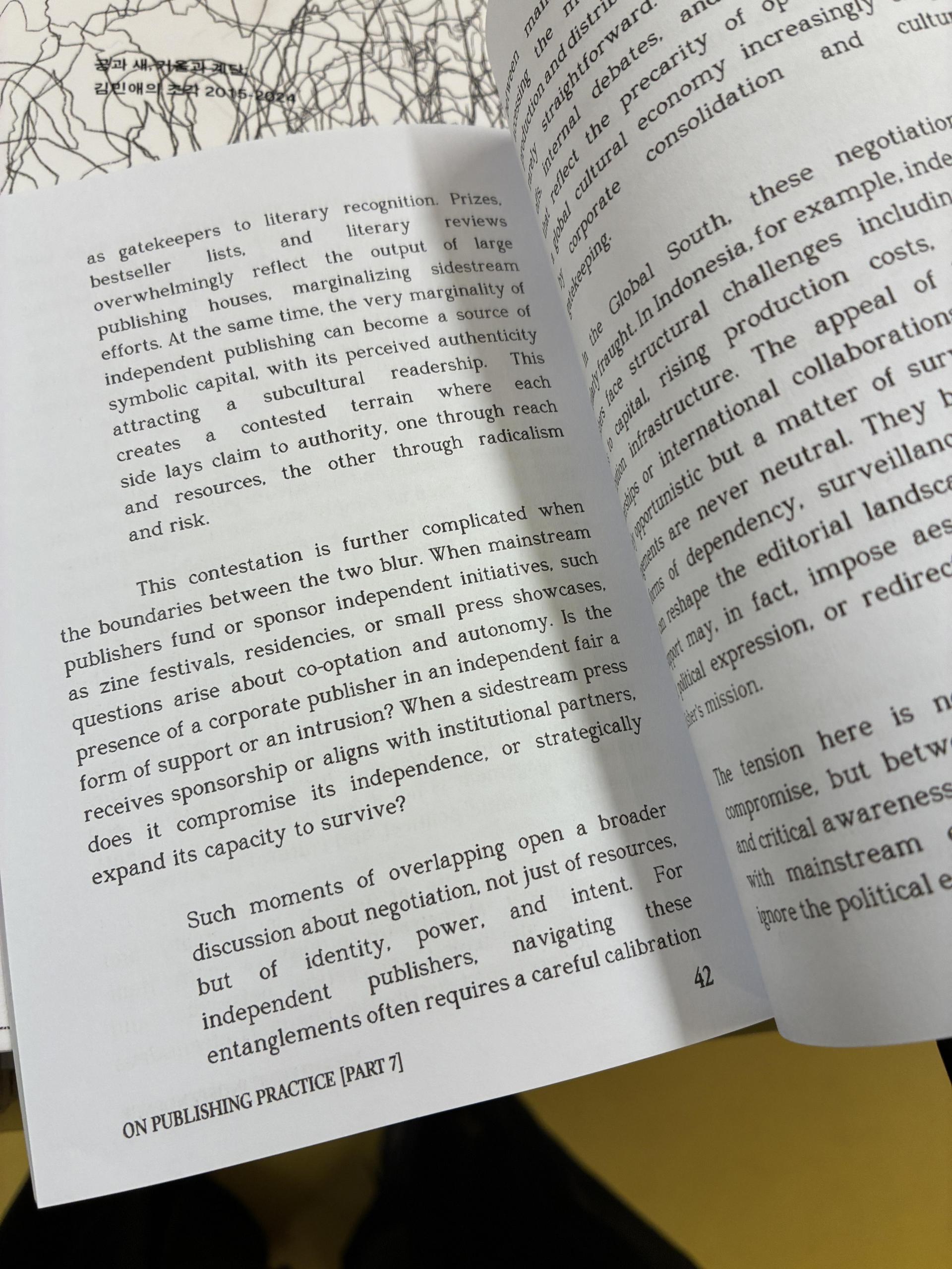 『On Publishing Practice』는 약 10년에 걸쳐 출판의 세계를 오가며 축적된 Daud Sihombing의 짧은 에세이, 성찰, 그리고 때로는 단상들을 모은 책이다. 깊이 개인적이면서도 비판적으로 단단한 시선으로 자신의 경험과 신념을 되짚는 한편, 한국 소장각의 노성일 등을 초대해 각자의 통찰, 피드백, 때로는 반론까지 더하도록 했다. 그 결과, 서로 다른 실천과 지역적 맥락이 더해진 겹겹의 대화가 만들어졌다. 저자성에서부터 아트북 페어의 확산에 이르기까지 다양한 주제를 가로지르는 이 책은 어떤 확정된 답을 제시하기보다, 출판이 무엇이 될 수 있는지를 묻고, 다시 생각하고, 새롭게 상상해볼 수 있는 공간을 내어준다.