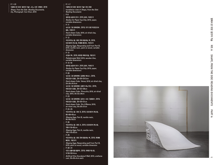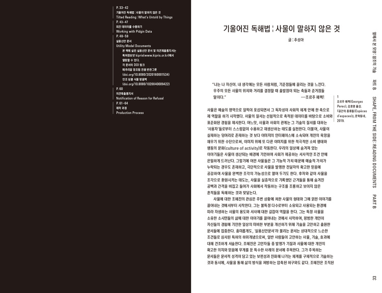 "기울어진 독해법: 사물이 말하지 않은 것(Tilted Reading: What's Untold by Things)"는 조혜진 작가의 «옆에서 본 모양 : 참조의 기술» 전시에 대한 기록과 더불어, 이전 작업에서 참조하고 있는 실용신안문서와 조각에 대한 작가의 태도를 함께 다룬 자료집 형식의 책입니다.
