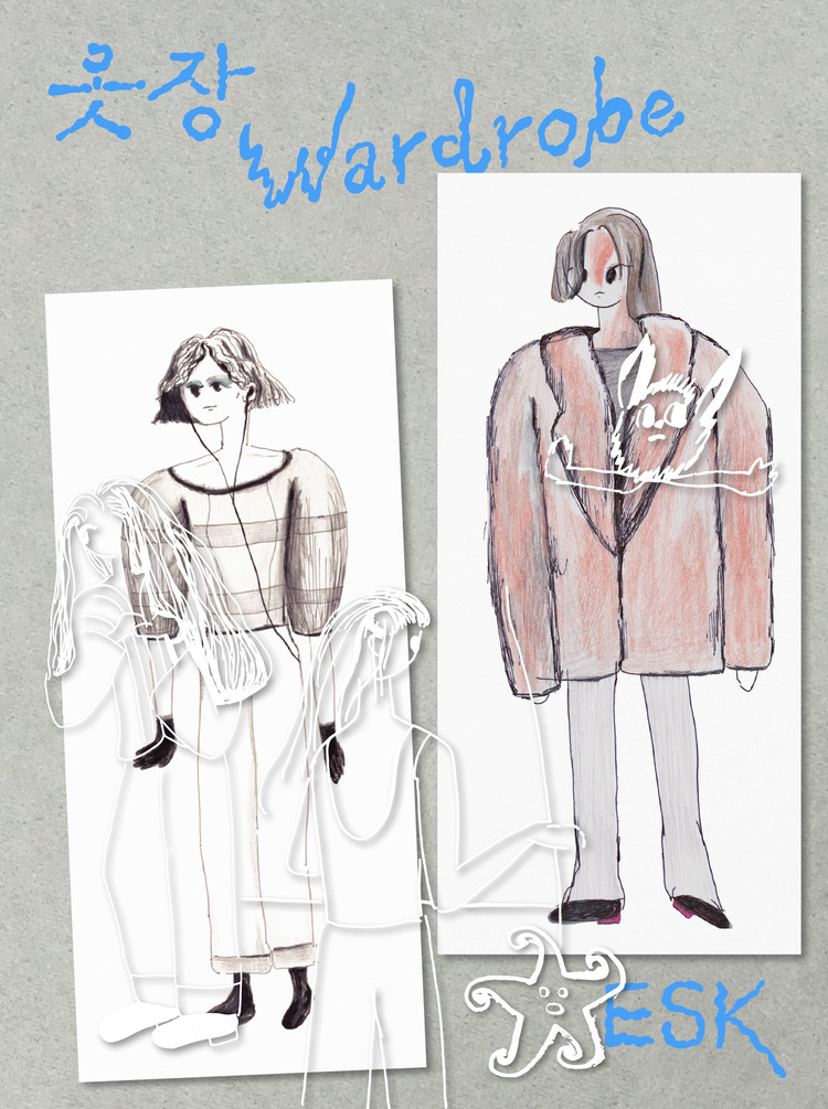 “수년간 작가 ESK가 옷을 접근하는 방식을 지켜봤다. 패션 작업자와 다른 시점으로 보는 옷의 패턴, 덩어리 감, 그것을 입는 소녀와 노인. 나는 그 방식이 마음에 들었고 어떤 드로잉은 실제 옷에 얹힌 것을 목격하기도 했다. 옷에서 다시 책으로 옮겨 온 작업들은 오랜만에 만난 친구처럼 반갑다.”