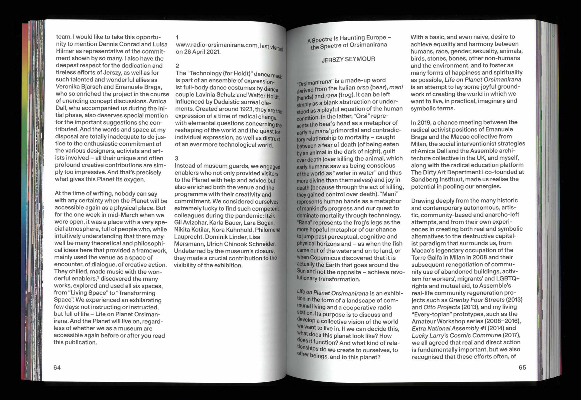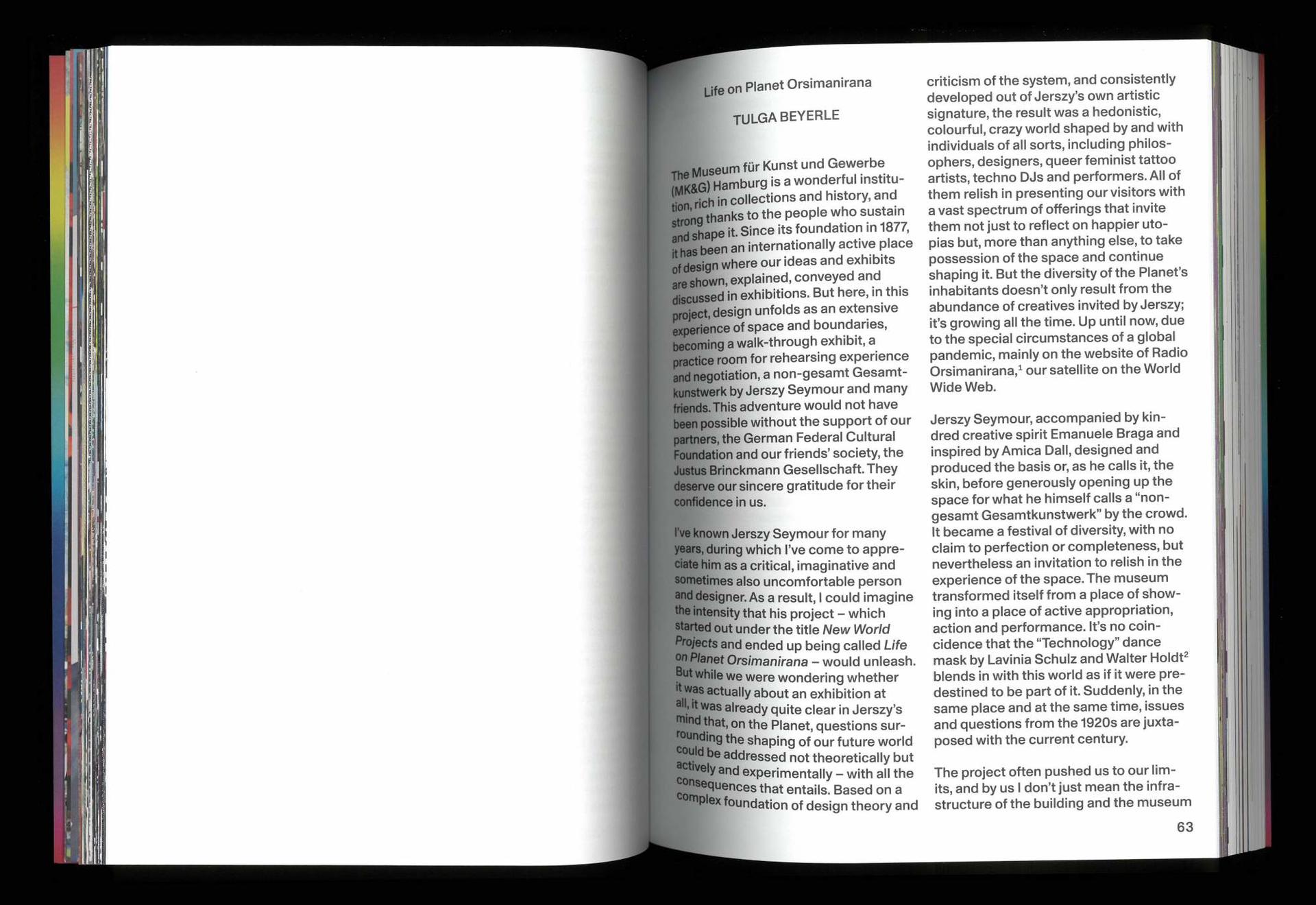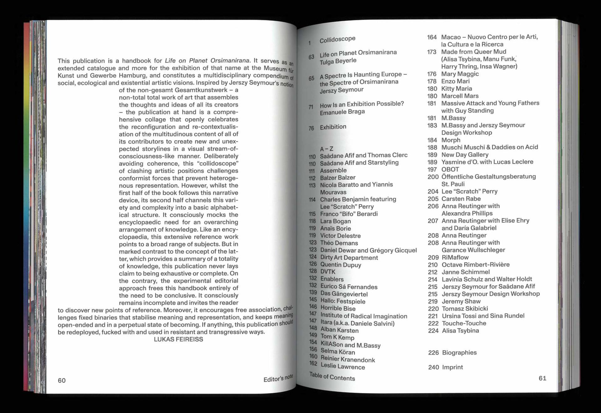 Life on Planet Orsimanirana is a project by Jerszy Seymour Design Workshop together with Macao, Assemble and The Dirty Art Department. This publication is a handbook for Life on Planet Orsimanirana. It serves as an extended catalogue and more for the exhibition of that name at the Museum für Kunst und Gewerbe Hamburg, and constitutes a multidisciplinary compendium of social, political, ecological and existential artistic visions. Inspired by Jerszy Seymour’s notion of the non-gesamt Gesamtkunstwerk the publication is a comprehensive collage and ”collidoscope“ by a diverse group of local and international collectives, activists, artists and designers. It brings together these varying and divergent positions in a visual stream of consciousness. It thereby aims to lay a joyful groundwork to create the world we want to live, on a practical, imaginary as well as symbolic level.