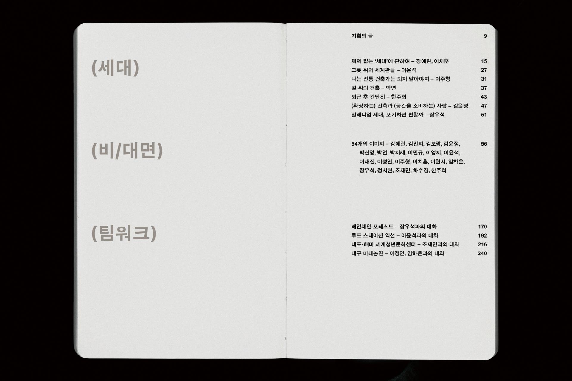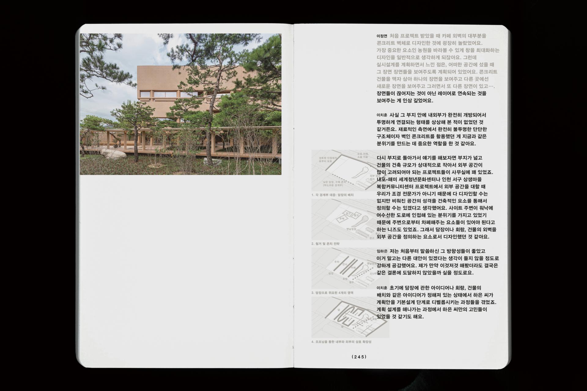 “처음 프로젝트 받았을 때 카페 외벽의 대부분을 콘크리트 벽체로 디자인한 것에 굉장히 놀랐었어요. 가장 중요한 요소인 농원을 바라볼 수 있게 창을 최대화하는 디자인을 일반적으로 생각하게 되잖아요. 그런데 실시설계를 계획하면서 느낀 점은, 어떠한 공간에 섰을 때 그 장면 장면들을 보여주도록 계획되어 있었어요. 콘크리트 건물을 액자 삼아 하나의 장면을 보여주고, 다른 곳에선 새로운 장면을 보여주고, 그러면서 또 다른 장면이 있고⋯.” 245쪽, 대구 미래농원 – 이정연, 임하은과의 대화