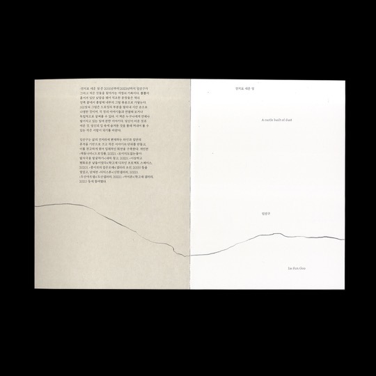 ‹먼지로 세운 성›(2023)은 임선구 작가가 권수진 디자이너, 김진주 편집자와 함께 2년간 준비한 드로잉북 신간입니다. 책은 2016년부터 2023년까지 임선구가 그리고 적은 것들을 찾아가는 여정을 기록하고 있습니다. 뿔뿔이 흩어져 있던 낱말을 꿰어 직조한 문장들은 책의 양쪽 끝에서 출발해 내부의 그림 묶음으로 가닿습니다. 162장의 그림은 드로잉의 부분을 잘라내 시간 순으로 나열한 것이며, 각 장의 이야기들과 연결해 보거나 독립적으로 살펴볼 수 있습니다. 이 책은 누구나에게 언제나 벌어지고 있는 일에 관한 이야기를 담고 있습니다. 당신이 비운 것과 메운 것, 당신의 입 속에 숨겨둔 것을 몰래 꺼내어 볼 수 있는 작은 서랍이 되기를 바랍니다.