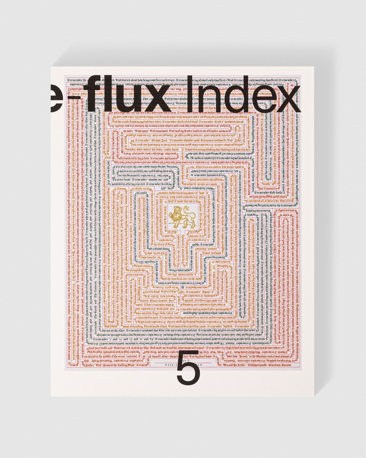 The fifth issue of e-flux Index features contributions from Rouzbeh Akhbari, Sanna Almajedi, Étienne Balibar, Rend Beiruti, Xenia Benivolski, Daniel Birnbaum, Hunter Bolin, Nathan Brown, Harry Burke, Luis Camnitzer, Mark Cinkevich, María Iñigo Clavo, Maya Deren, Jacob Dreyer, Anna Engelhardt, Solveig Font, Kenny Fries, Coco Fusco, Orit Gat, Leo Goldsmith, Ana María Gómez López, Andrea González Garrán, Boris Groys, Lauren van Haaften-Schick, Barbara Hammer, Dehlia Hannah, Isobel Harbison, Jörg Heiser, Yuk Hui, Kateryna Iakovlenko, Celia Irina González, Juan José Santos, Aubrey Knox, Hamlet Lavastida, Debra Lennard, Sophie Lewis, Julio Llópiz Casal, R.H. Lossin, Vijay Masharani, Azadeh Mashayekhi, Naeem Mohaiemen, Yanelys Nuñez Leyva, Hans Ulrich Obrist, Trevor Paglen, Furqat Palvan-Zade, Artavazd Peleshyan, Sol Pérez-Martinez, Precarious Workers Brigade, Irit Rogoff, Mila Samdub, Stephanie Sherman, Henk Slager, Jonas Staal, Bernard Stiegler, Thotti, Ina Valkanova, Elena Vogman, Pramodha Weerasekera, Evan Calder Williams, Virginia Woolf, and Gary Zhexi Zhang.