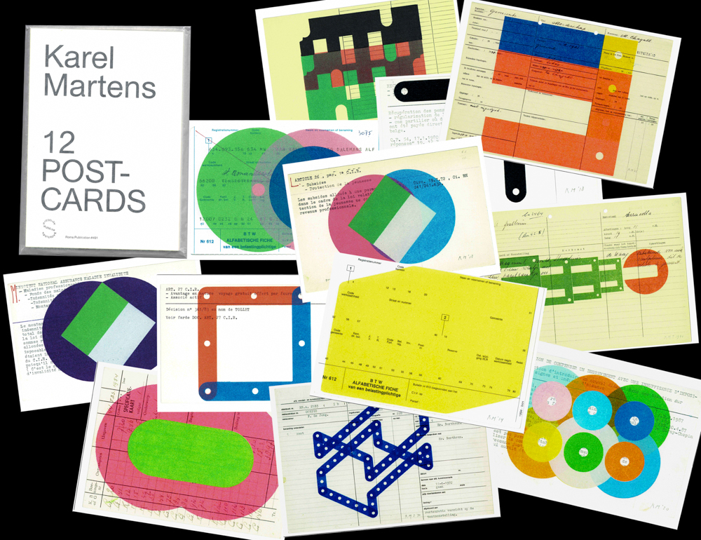 A set of 12 postcards of monoprints by Karel Martens, published to accompany the first major retrospective exhibition at Stedelijk Museum Amsterdam.