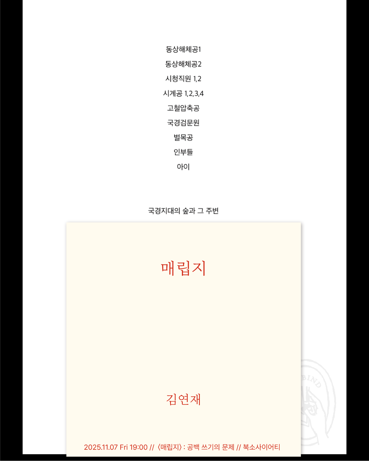 〈매립지〉는 한 편의 희곡이자, 희곡과 무대 사이의 공백을 드러내는 하나의 장소다. 희곡 〈매립지〉를 함께 읽고 감상과 상상을 나누며, 희곡 언어의 수행성과 수행 불가능성(수행의 곤란함)이 동시에 어떻게 ‘희곡 쓰기’의 주요한 조건이 되는지 이야기한다. 나아가 의미의 공백을 관측하는 일이 도대체 어떤 쓸모가 있는지 고민해본다.