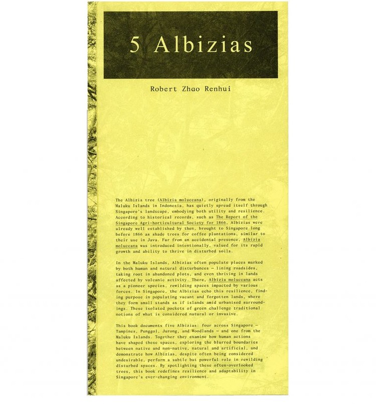 이 책은 다섯 그루의 알비지아를 기록한다. 싱가포르 전역에서 네 그루, 그리고 몰루카 제도에서 한 그루다. 이들은 인간의 행위가 어떻게 공간을 형성해왔는지를 살피며, 토착과 비토착, 자연과 인공의 경계가 흐려지는 지점을 탐구한다. 또한 흔히 불필요하다고 여겨지지만 알비지아가 교란된 공간을 되살리는 데 은근하면서도 강력한 역할을 한다는 점을 보여준다. 이 프로젝트는 주목받지 못했던 이 나무들을 조명함으로써, 끊임없이 변화하는 싱가포르 환경 속에서 회복력과 적응력의 의미를 새롭게 정의한다. 김해주의 글과 기록 사진으로 구성된 서문을 담고 있으며, 책과 동명의 전시에 맞추어 출간되었다. 전시는 싱가포르 곳곳에서 발견·기록된 네 장소를 순회하며 진행되었다.