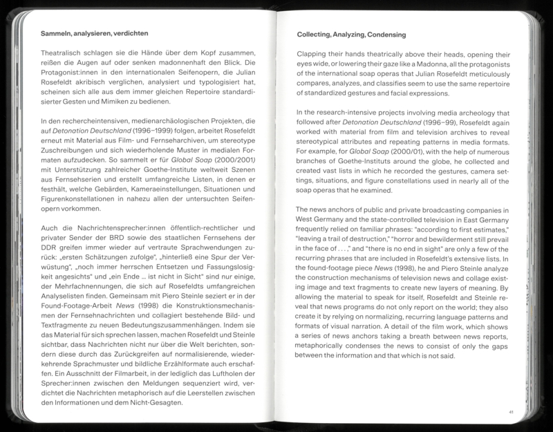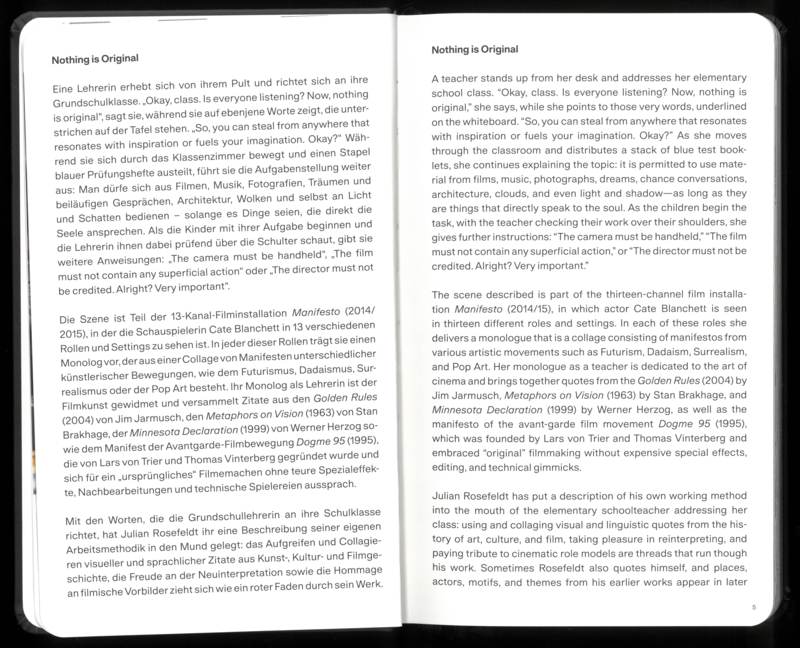 율리안 로제펠트(Julian Rosefeldt)의 작업 세계를 포괄적으로 조망하는 『Nothing Is Original』은 C/O 베를린이 지난 30여 년간 그가 만들어온 작품들을 한데 모은 최초의 전시이자 출판물이다. 이 책에는 지금까지 공개되지 않았던 스토리보드, 스케치, 촬영 현장 사진, 제작 다큐멘터리뿐 아니라 이미지가 어떻게 만들어지는지를 보여주는 개인적인 비화들이 함께 담겨 있다. 건축학 수업 시절의 연구와 초기 포토리포트, 연극 작업에서 출발하여 영화적 허구와 정교하게 연출된 필름 설치로 나아가는 그의 예술적 궤적을 따라간다.