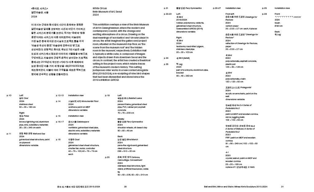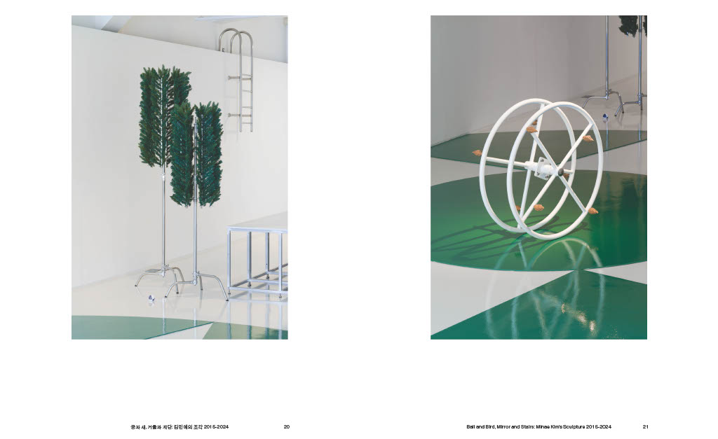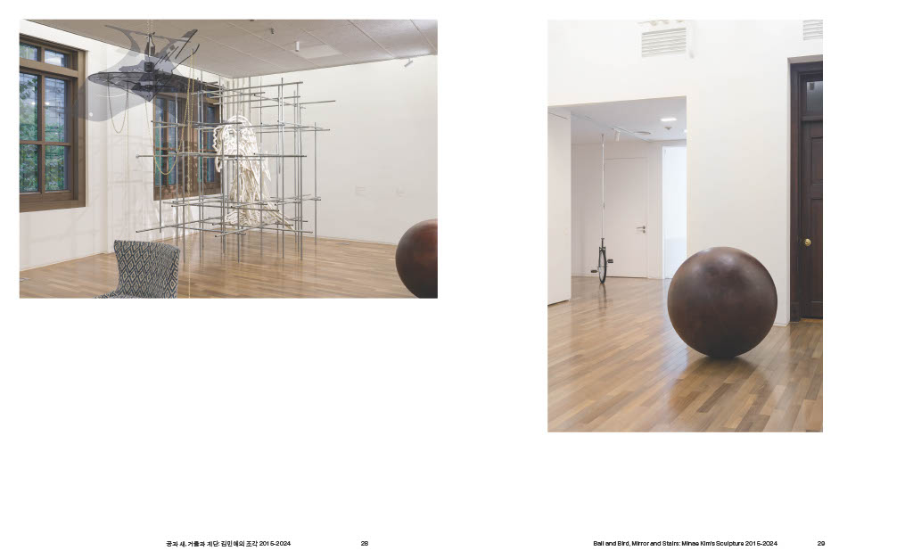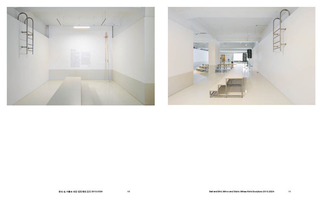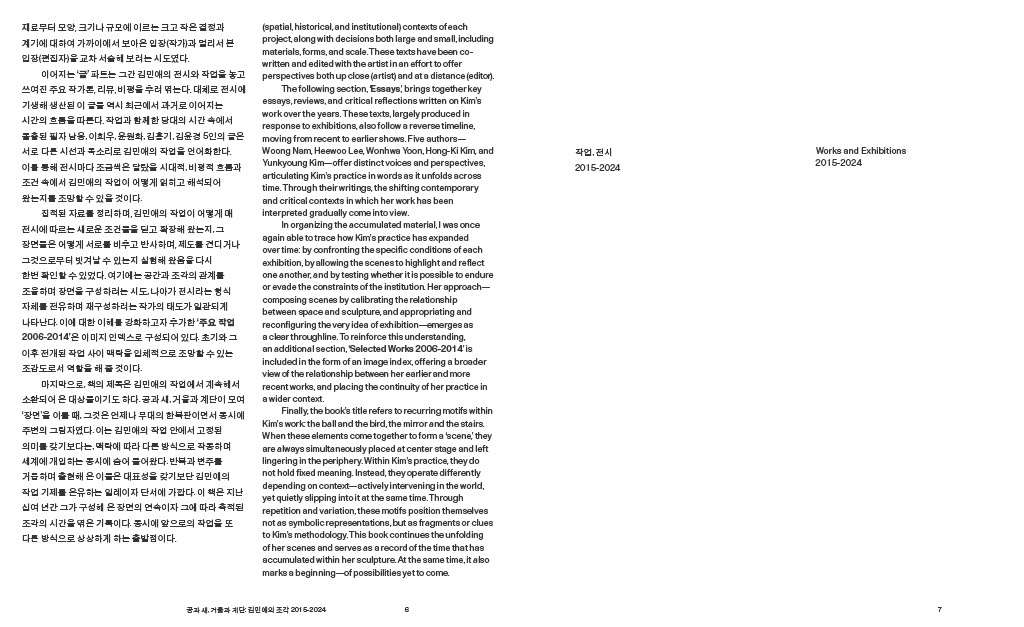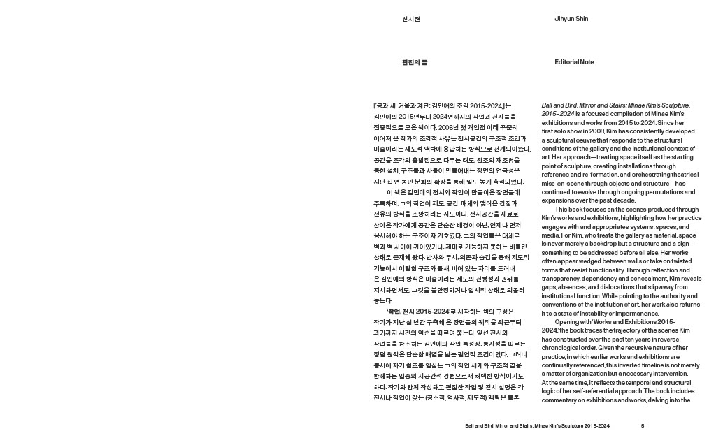 『공과 새, 거울과 계단: 김민애의 조각 2015─2024』지난 10년간 김민애가 전개해 온 전시와 작업을 통합적으로 조망하는 모노그래프이다. 최근에서 과거로 거슬러 가는 통시적 배열을 따라 전시와 작업을 살피며, 남웅, 이희우, 윤원화, 김홍기, 김윤경 등 다섯 필자의 비평을 함께 수록하여 책을 구성하였다.