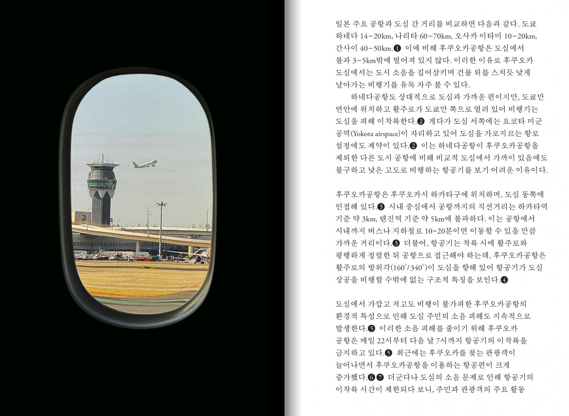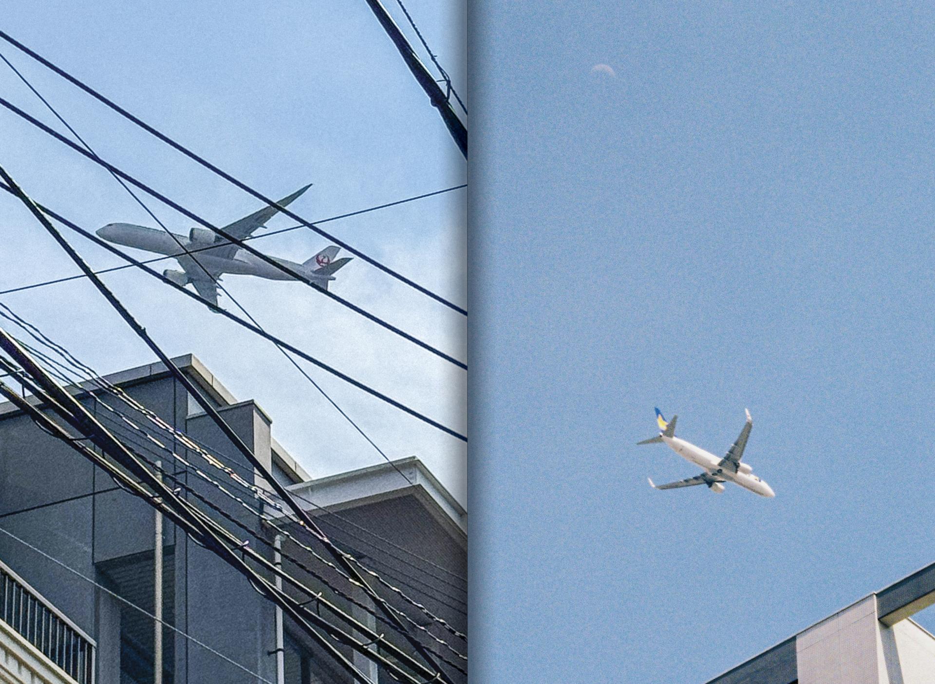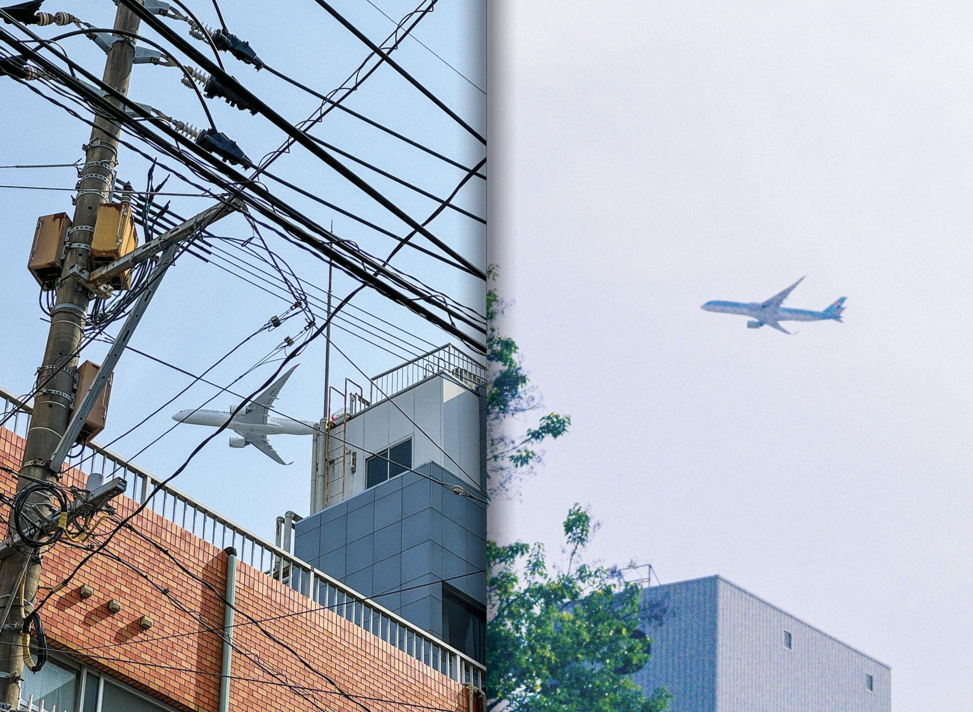〈후쿠오카의 하늘은 너무 낮아서 머리 위로 비행기가 흐른다〉는 후쿠오카공항의 환경적 특성상 도심 상공에서 낮게 비행할 수 밖에 없는 항공기의 모습을 찍은 것이다.