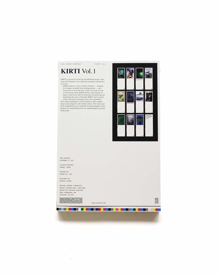 베트남을 거점으로 활동하는 리서처, 헌터 P. 디어필드(Hunter P. Deerfield)의 작품집. 그가 전개하는 'KIRTI'라는 프로젝트의 아카이브가 되는 한 권입니다. KIRTI는 헌터가 각국의 아티스트를 인터뷰하고, 그 내용을 체류 중인 지역에서 로컬 인쇄로 제작하는 프로젝트입니다. 형태는 일반적인 A4 사이즈이며, 복사 센터와 같은 주변의 인쇄소에서 출력됩니다. 이는 출판이 어렵거나 인쇄 비용이 비싸고, 발표를 위한 플랫폼이 한정적인 동남아시아 일부 지역에 대한 하나의 대항적 접근이기도 합니다. 각 책자에는 제작일과 제작 장소(도시, 국가)가 수기로 기록되어 있어, 아티스트 에디션과 같은 정취를 풍깁니다. 새로 인쇄될 때마다 내용은 업데이트되며, 그 토지에 '녹아들 듯' 배포됨으로써 프로젝트가 지속적으로 전개되어 나갑니다. (번역 Gemini)